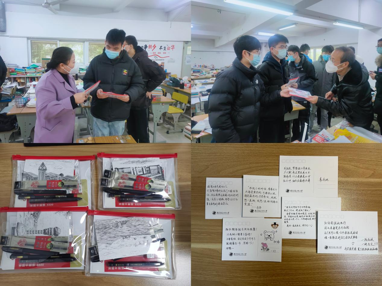 李俊平、刘彦、刘晓通三位老师代表学院向正在积极奋战的学子们表达了深切的关爱和鼓励,还为他们带来了学院精心准备的爱心加油文具包,里面各种考试文具一应俱全。除此之外,还有一张张南信大手绘明信片,上面有20级学弟学妹们亲手为考研学长学姐写下的满满祝福。